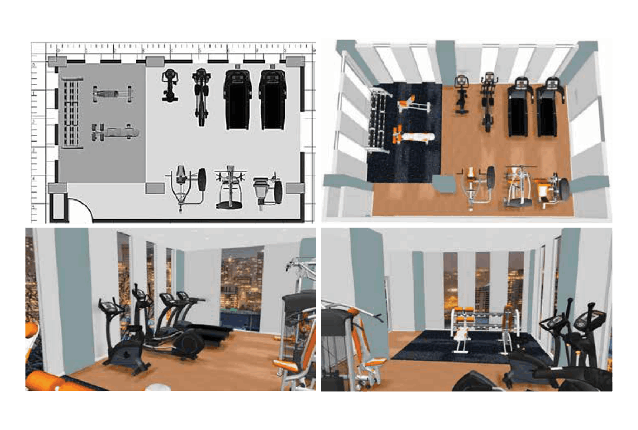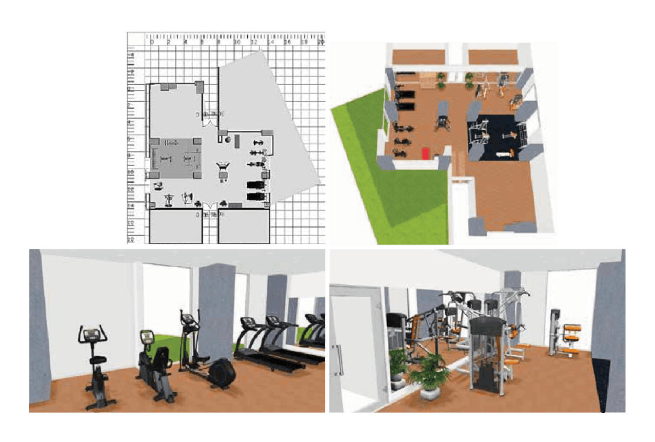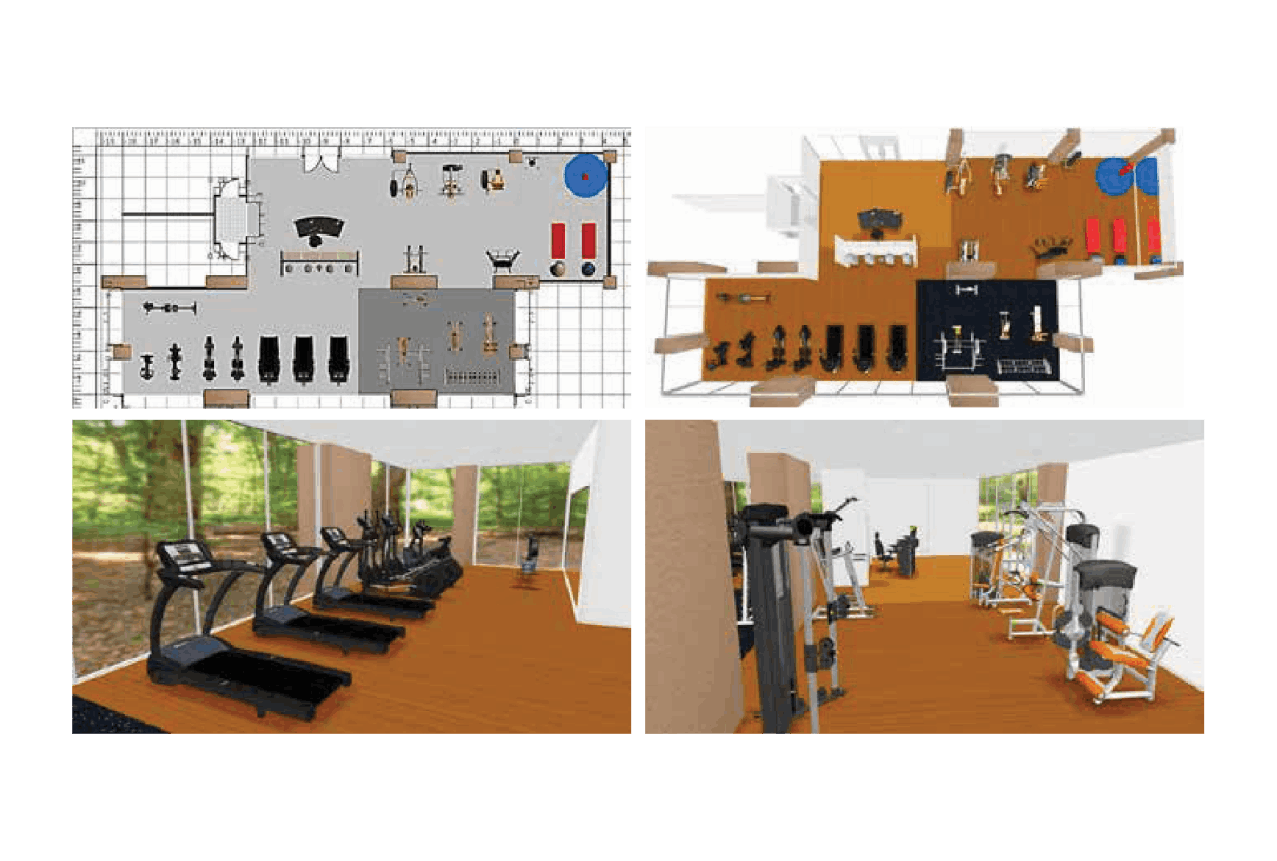 Bersama tim desain internal yang berdedikasi, kami membantu Anda merancang tata letak pusat kebugaran, home gym, fitness rumah, dan alat gym rumahan dengan gambar teknis 3D profesional, lengkap dengan perabotan dan peralatan.