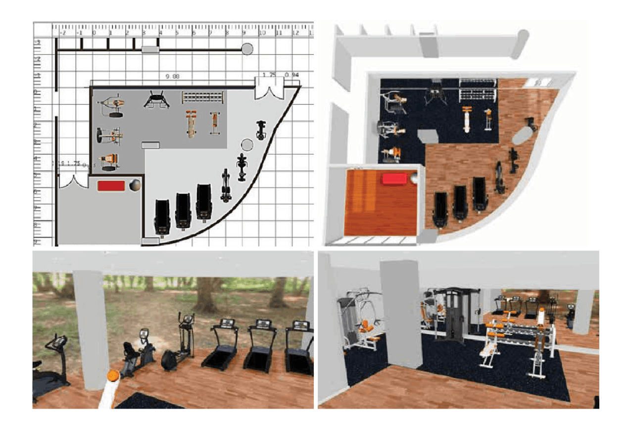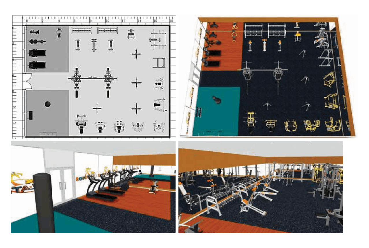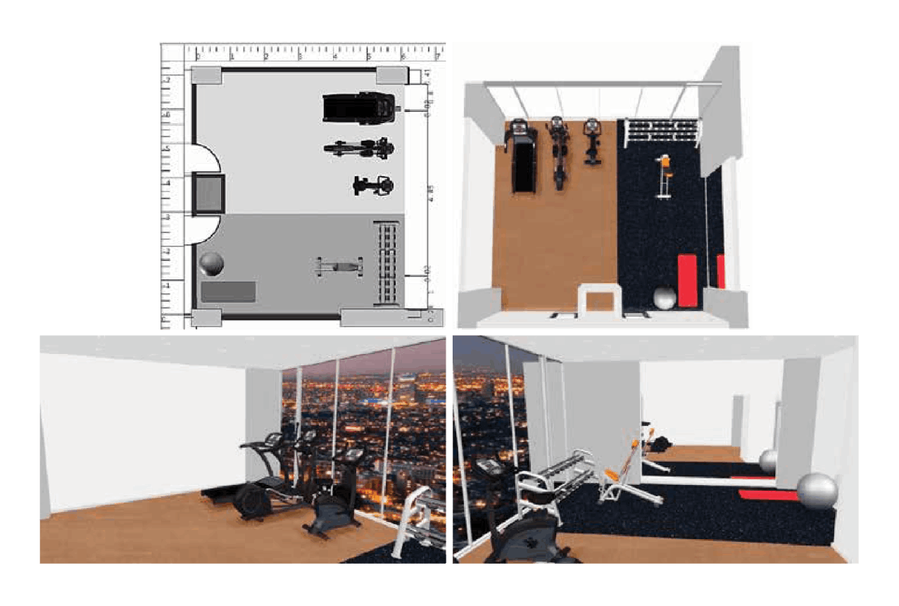Bersama tim desain internal yang berdedikasi, kami membantu Anda merancang tata letak pusat kebugaran, home gym, fitness rumah, dan alat gym rumahan dengan gambar teknis 3D profesional, lengkap dengan perabotan dan peralatan.